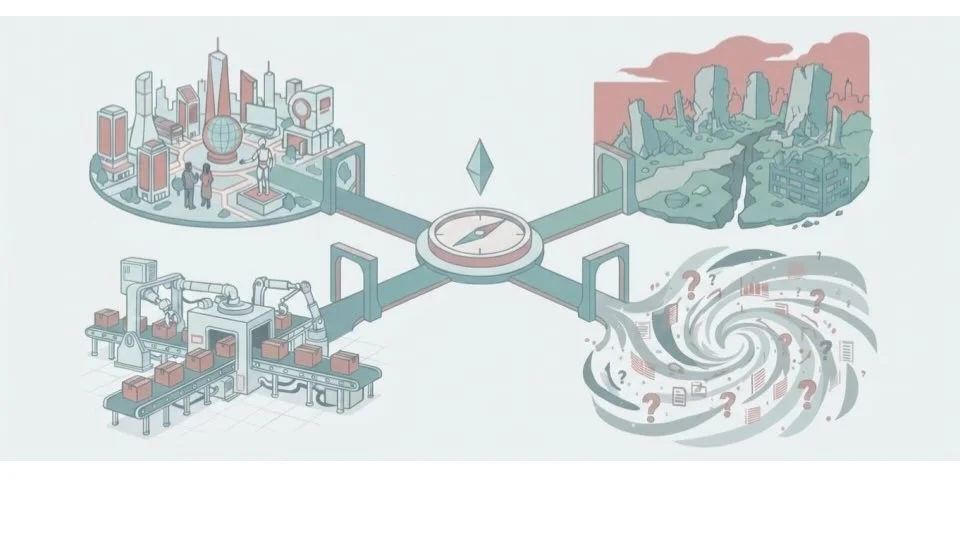 These futures are not predictions. They are navigation tools. They’re structured thought experiments designed to help you stress-test today’s decisions against multiple possible outcomes and clarify what capabilities matter most under different conditions.
